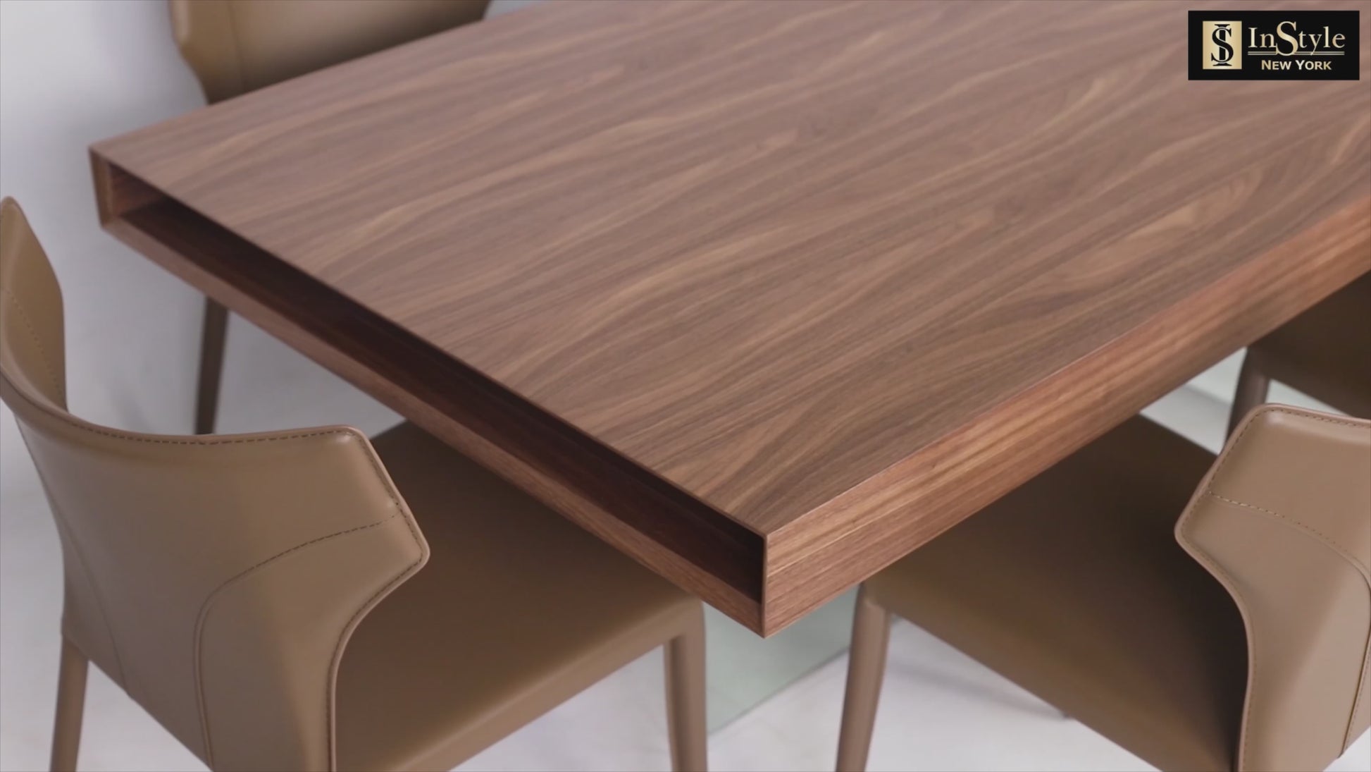 Despite the table top appearing to be a solid block of wood, it is actually a cleverly designed top finished with a beautiful walnut veneer, adding warmth and elegance to the overall design.